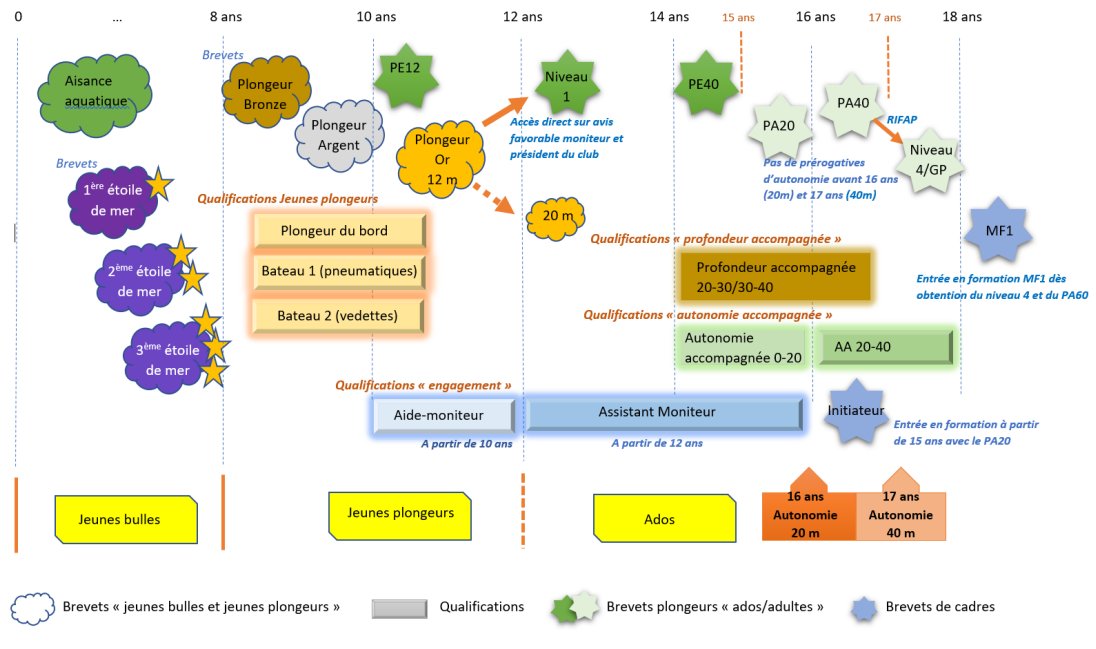 Les cursus « jeunes plongeurs » : La plongée en immersion avec scaphandre ne peut se pratiquer qu’à partir de 8 ans.